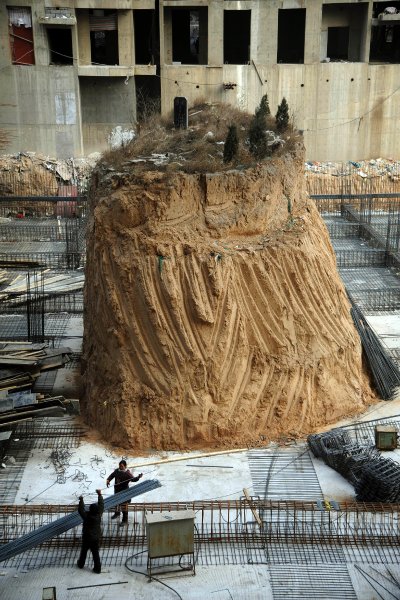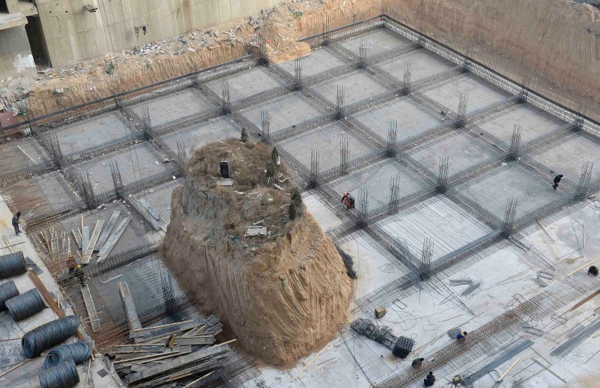 Hier zu sehen: Ein Grab, das die Angehörigen nicht umsiedeln wollten. Es stand dem Bau eines Hochhauses im Wege. Also wurde drum herumgebaut.