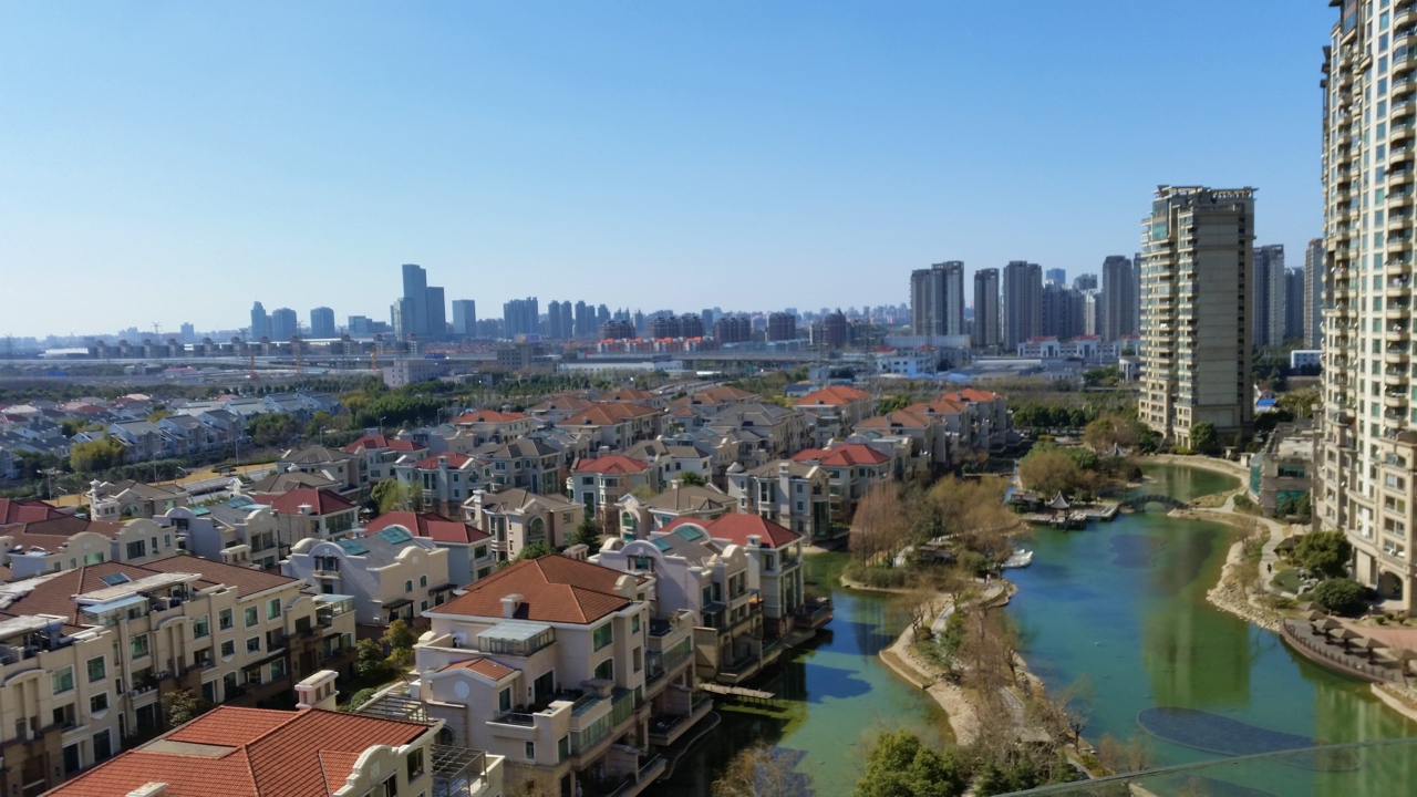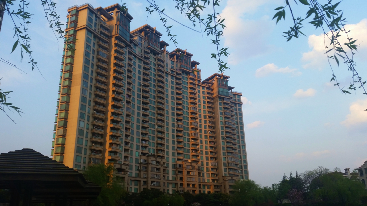 6:40h: Aufstehen. Der Blick aus dem Fenster im Compound Shimao Lakeside Garden zeigt bestes Wetter, blauer Himmel.