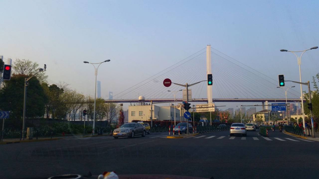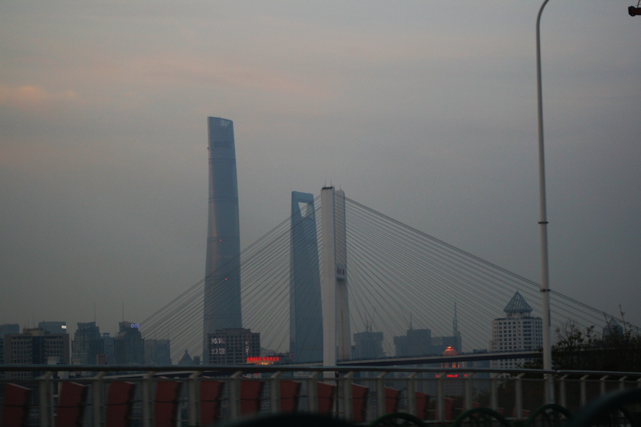 8:30h:  Auf dem Weg ins Büro kommen wir an einer der Brücken über den Huangpu River vorbei. Die Brücken sind alle enorm hoch wegen der Seeschiffe die hier den Fluß befahren. Keine Spur von Nebel.