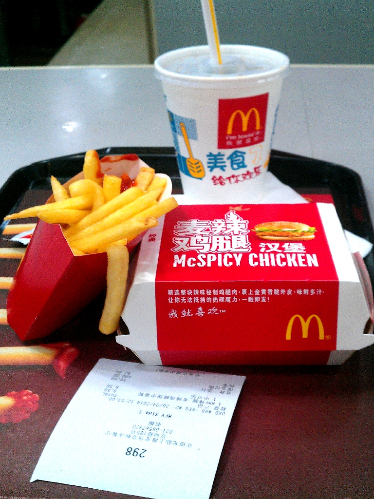 Ich versuche es mit dem „Spicy McChicken“. Der ist wirklich scharf. Im Gegensatz zu Deutschland ist hier ein richtiges Stück Huhn auf dem Burgerbrötchen, keine zusammengesetzte Masse. Das Menu kostet nur 18 RNB = 2,25 Euro.