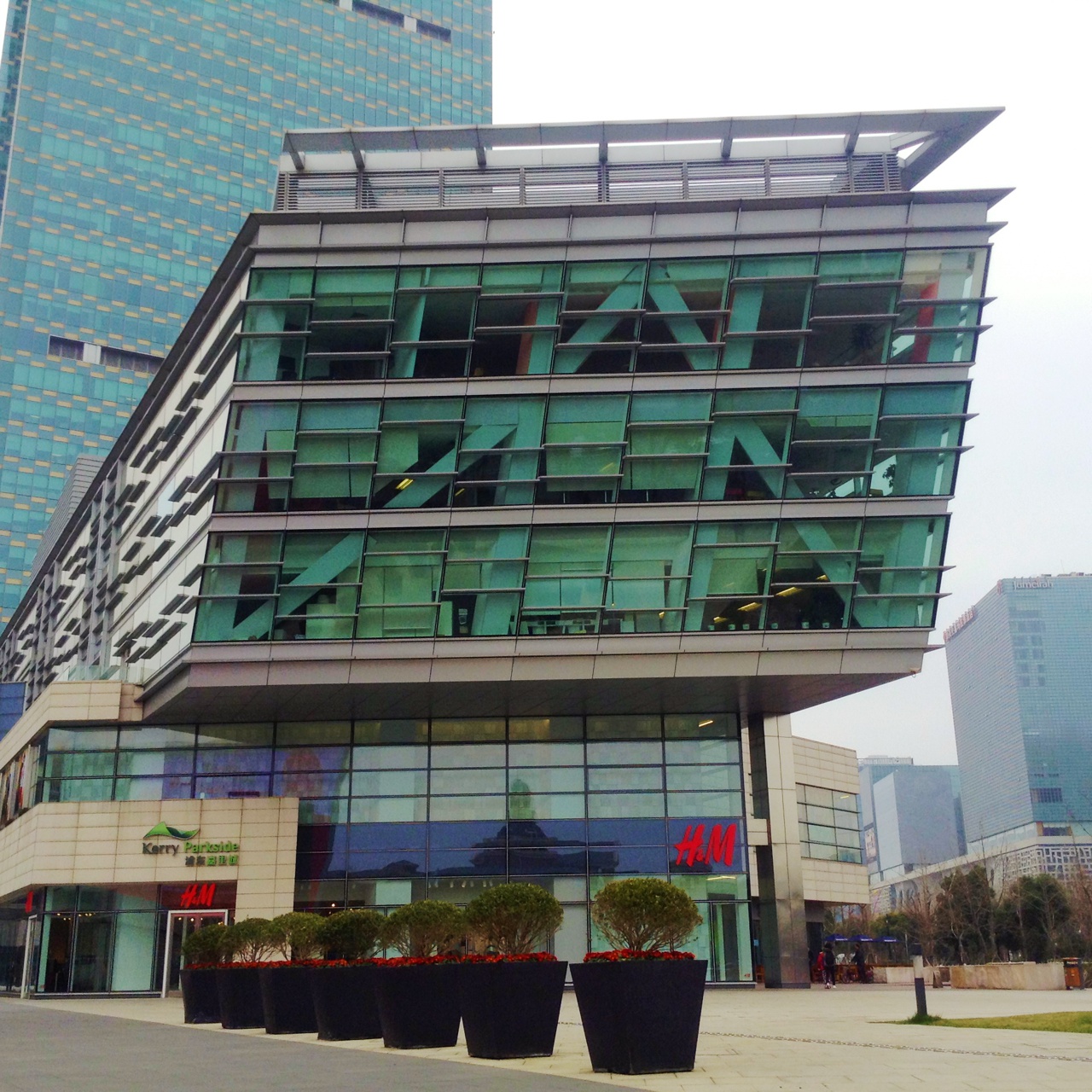 Direkt bei der Endstation der Linie 7 , Huamu Rd, liegt das Kerry Parkside Gebäude. Man erkennt es hauptsächlich am H&M-Logo an der Fassade zur Straße.