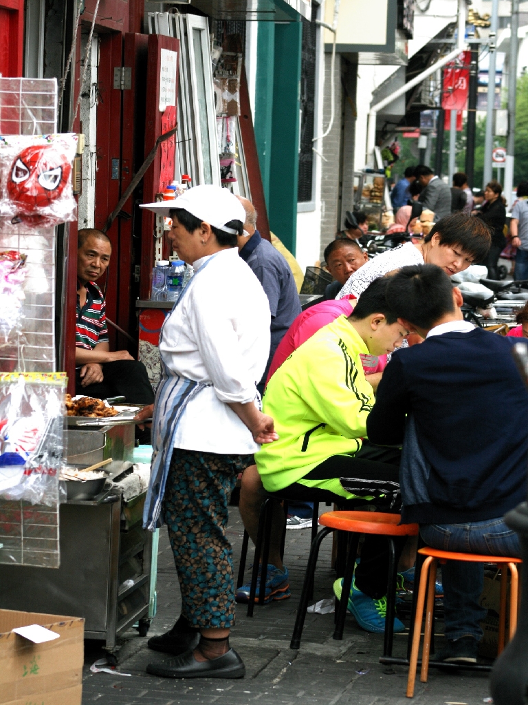 Auf der Straße vor den Geschäften wird ein Imbiß improvisiert. Man ißt auf dem Bürgersteig: