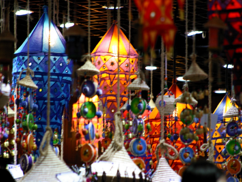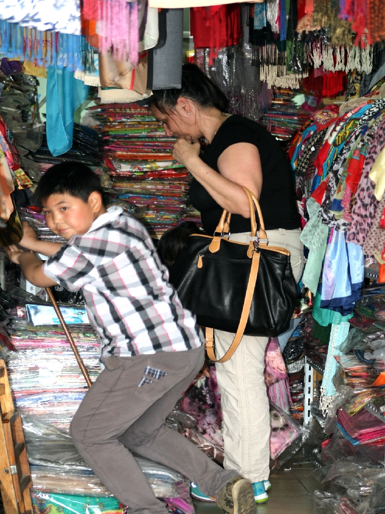 Draussen im Freien kaufen wir einen fliegenden Fisch für den Balkon, einen Rucksack und diverse Seidentücher.