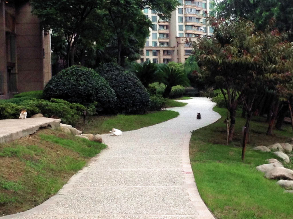 Am See des Shimao Lakeside Garden Compounds gibt es viele junge Katzen. Vermutlich wilde Katzen, jedenfalls sind sie sehr vorsichtig und scheu und verschwinden schnell unter den Hecken wenn man hurtigen Schenkels vorbeikommt.