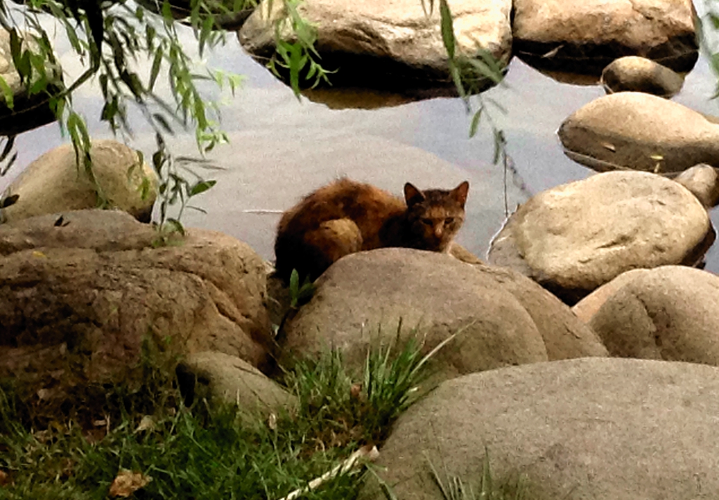 Diese Katze macht es sich alleine am Wasser gemütlich. Dort gibt es viele kleine Leckerbissen (Fische).