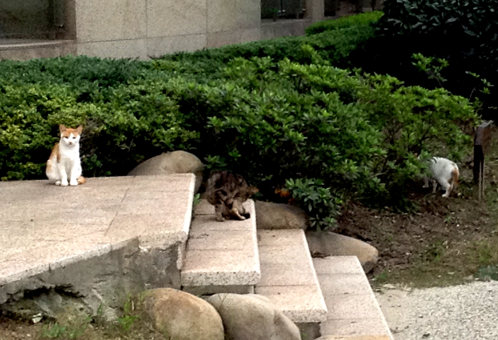 Hier lausen sich noch zwei Katzen, die Dritte sucht bereits Deckung im Gebüsch.
